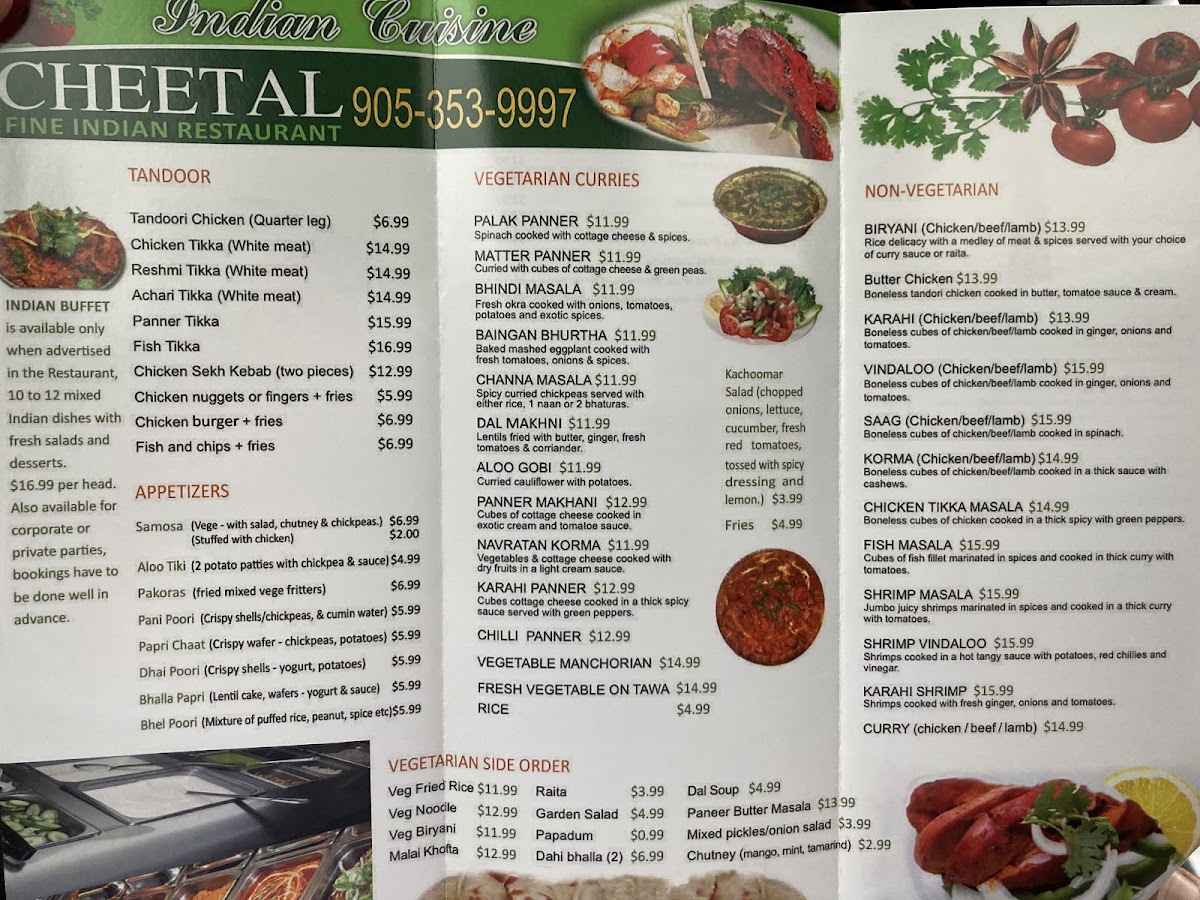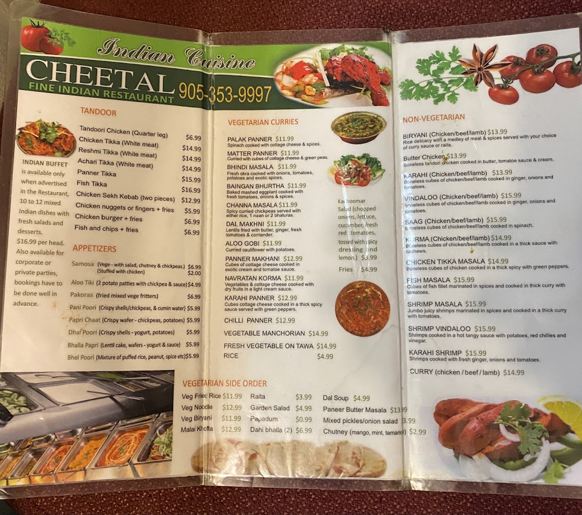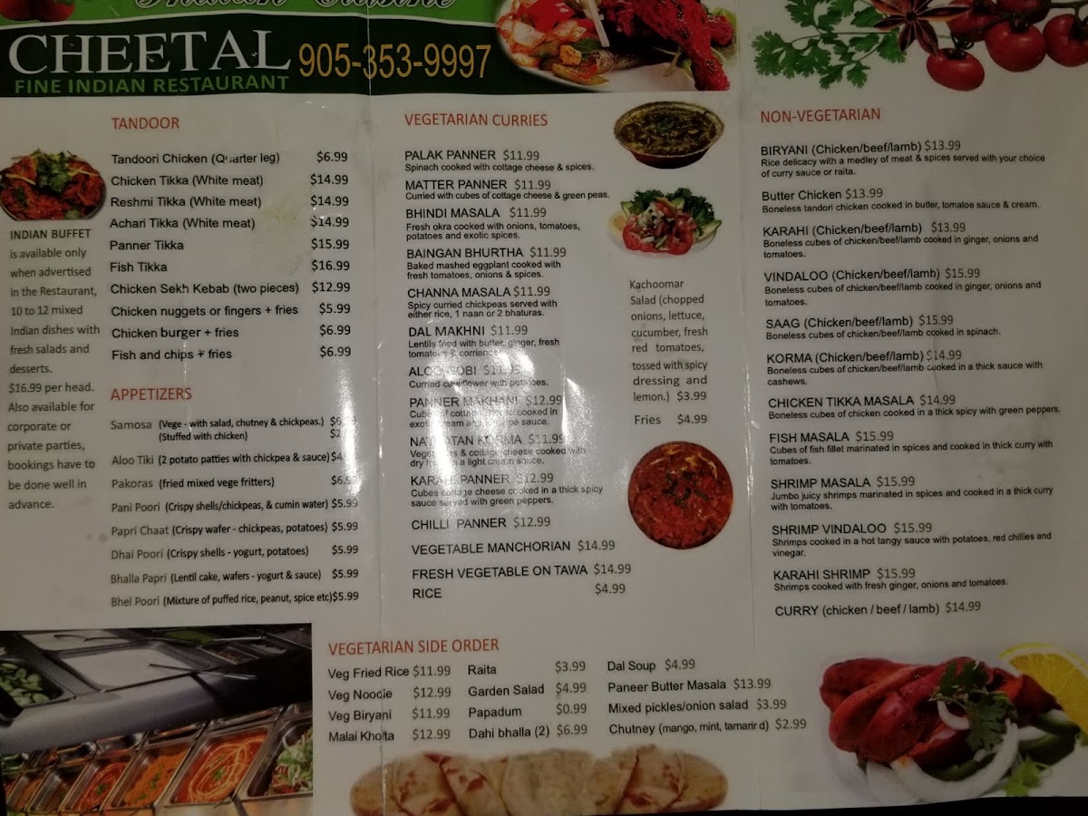 Welcome to Cheetal Indian Cuisine, where every dish is a celebration of vibrant flavors and rich traditions. Nestled in the heart of Niagara Falls at 5951 Clark Ave, we invite you to explore a menu that boasts a delightful array of Indian specialties. From the crispy and savory BHEL POORI and the tangy PANI POORI to the comforting VEGGIE SAMOSA and irresistible ALOO TIKI, our offerings are sure to tantalize your taste buds. Don't miss out on our unique twists like Fish and Chips and Chicken Fingers, alongside classic favorites such as BHALLA PAPRI, DHAI POORI, and Pakoras. Whether you're a lifelong fan of Indian cuisine or a curious newcomer, there's something for everyone at Cheetal Indian Cuisine—come hungry and leave happy!